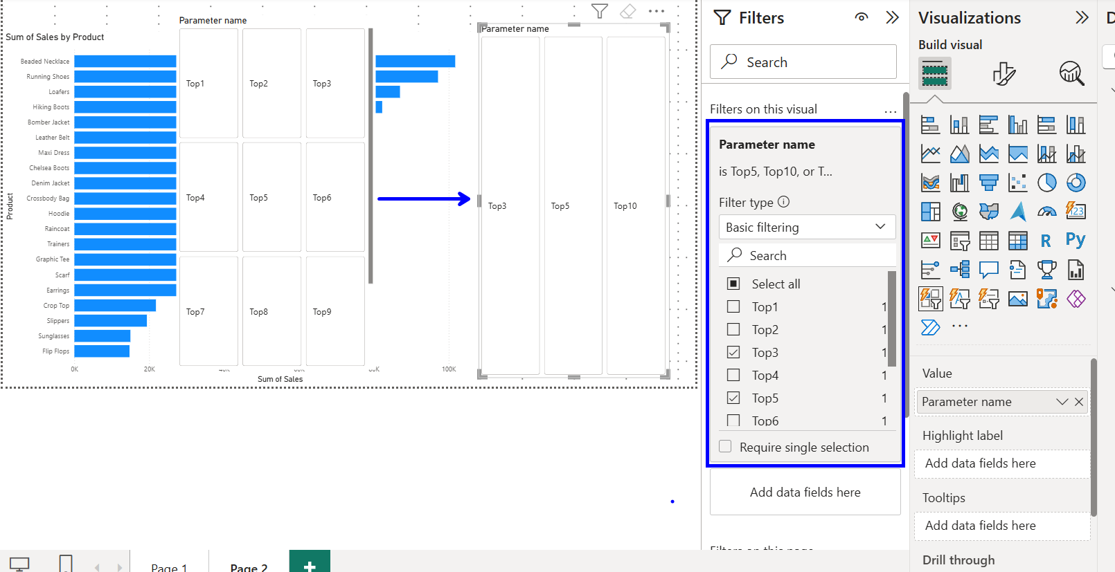 Lets make a report which looks at our top selling products and includes a dynamic subtitle which updates based on our selected Top N products.