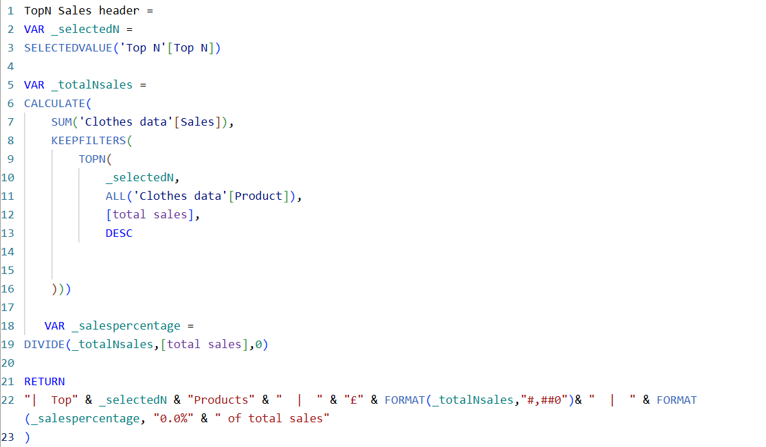 The next step is to create our dynamic report subtitle. To do this we are once again going to use our good friend VAR. Firstly, I have once again created our _selectedN variable. Now I need to make a variable which only returns the total sales for our "coloured bars," this calculation in essence is saying to sum the total sales for all products ranked down to our parameter value (e.g., Top 3 = the sales of the top 3 products). The final variable we require is _salespercentage, the percentage of the total sales our Top N values makes up. This variable is simply our Top N sales divided by our Total sales.