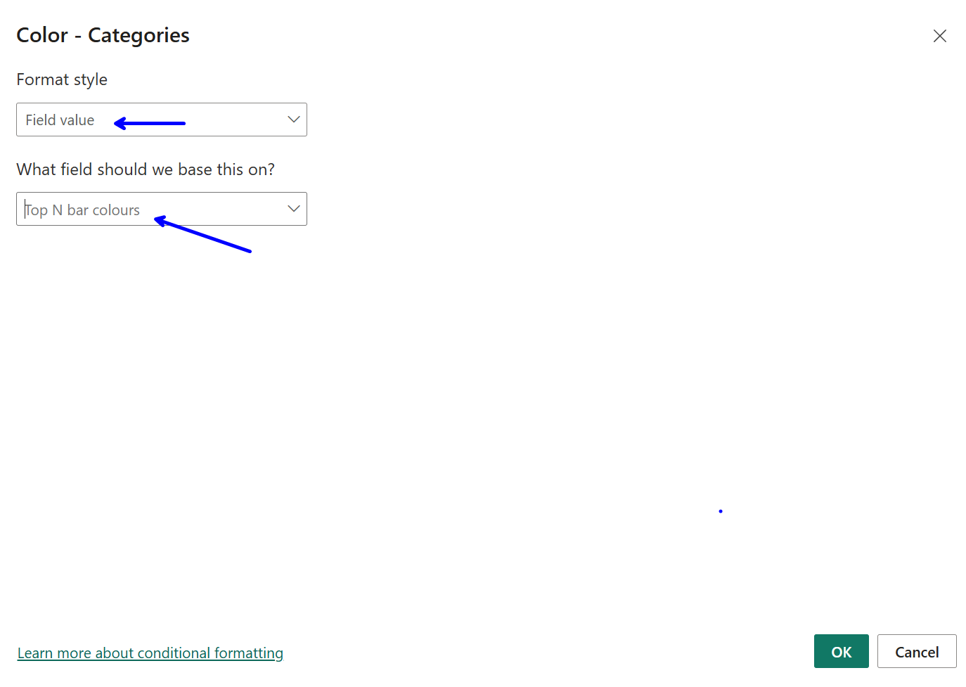 Next lets go format our bar colours. To do this go into Bars and select fx within here we can change our format style to field value and base that field value on our Top N bar colours measure. Now as you can see in the following image our bar colours will update with our parameter.