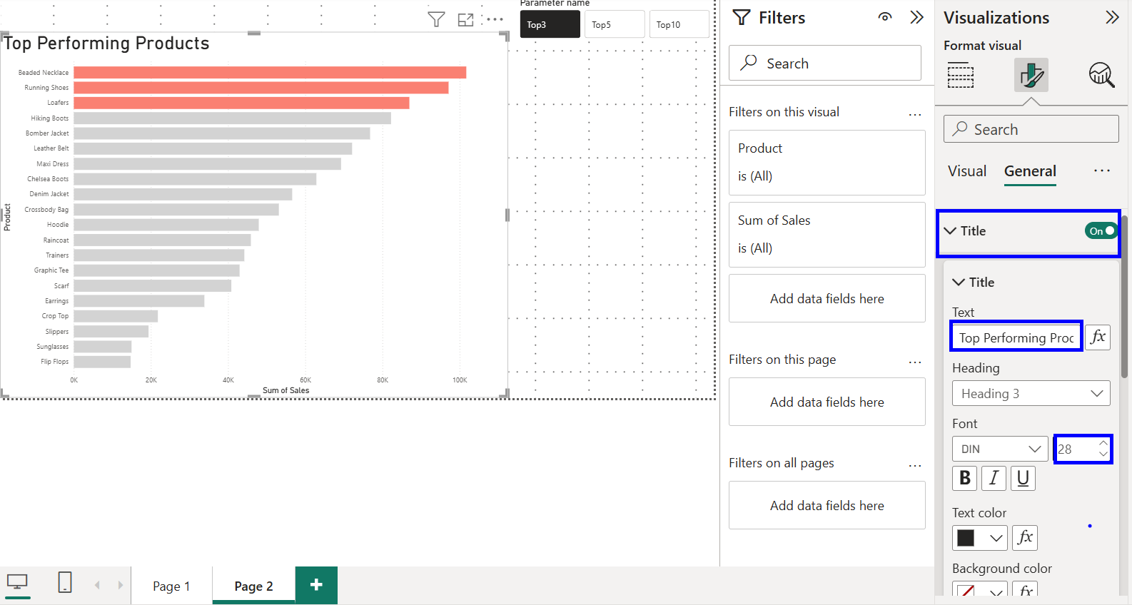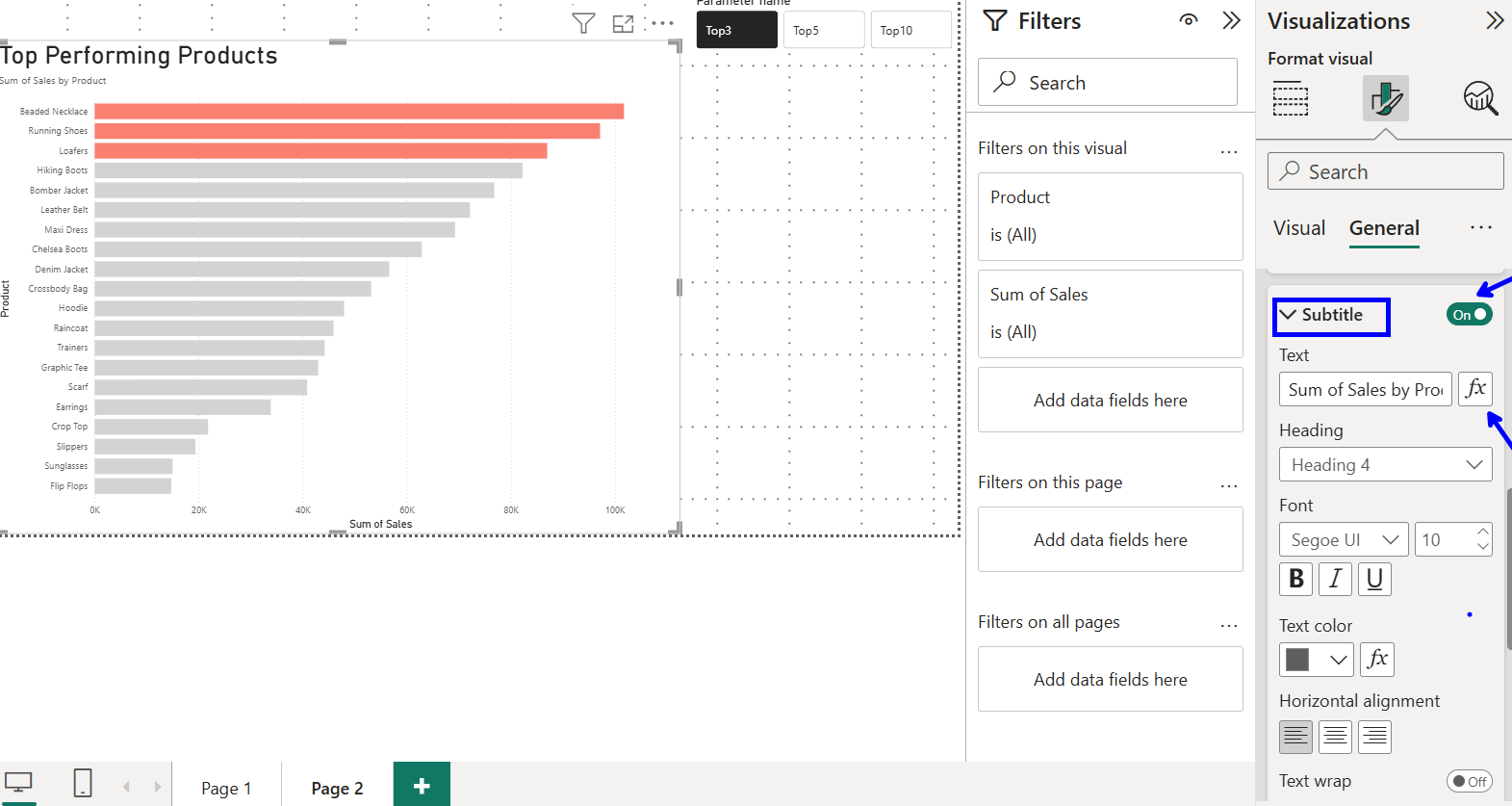 Now we have our dynamic subtitle, lets first update the reports actual title to "Top Performing Products."