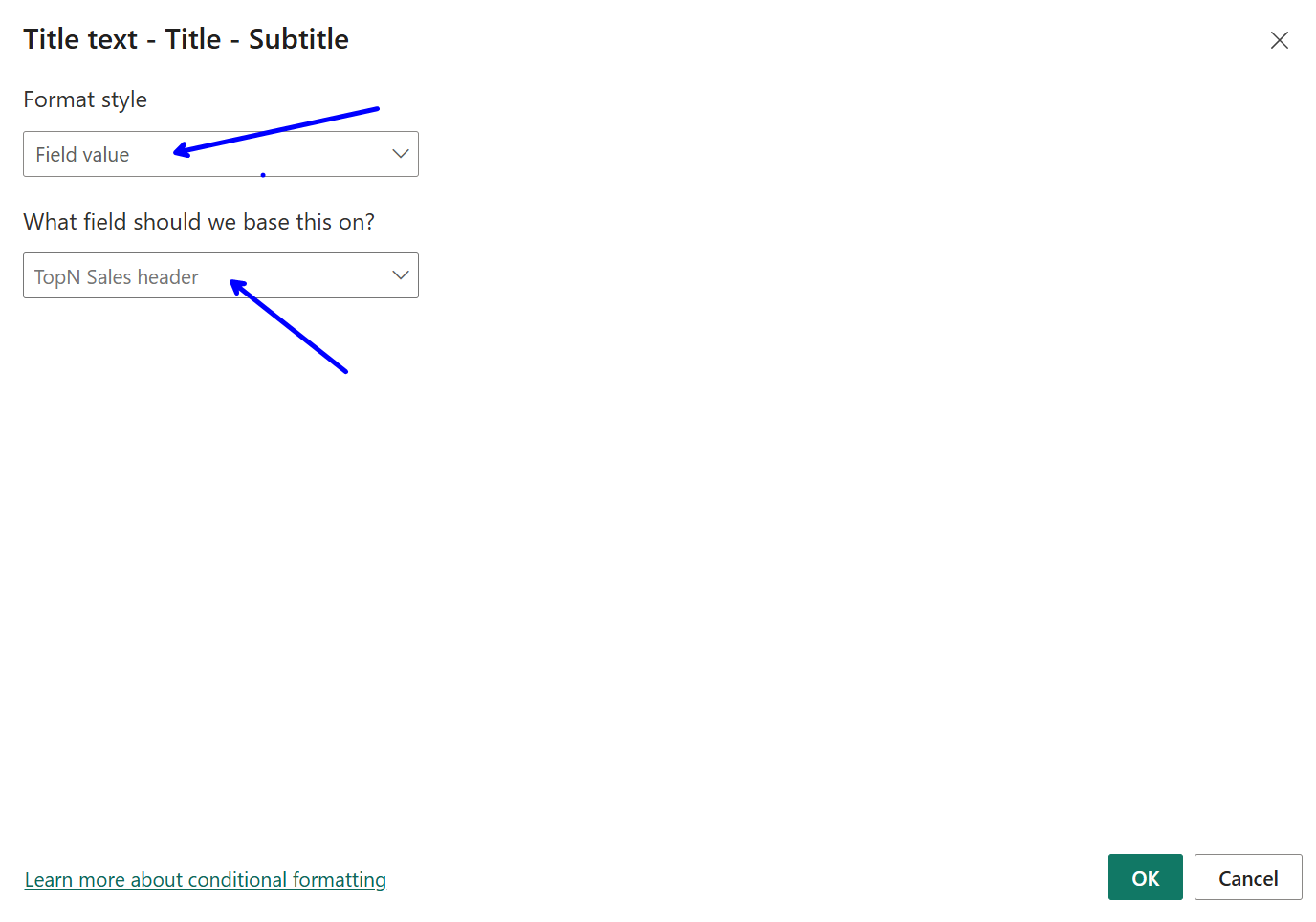 Just like our bar colours before, we need to change our format style to field value with the value its based on our TopN Sales header.