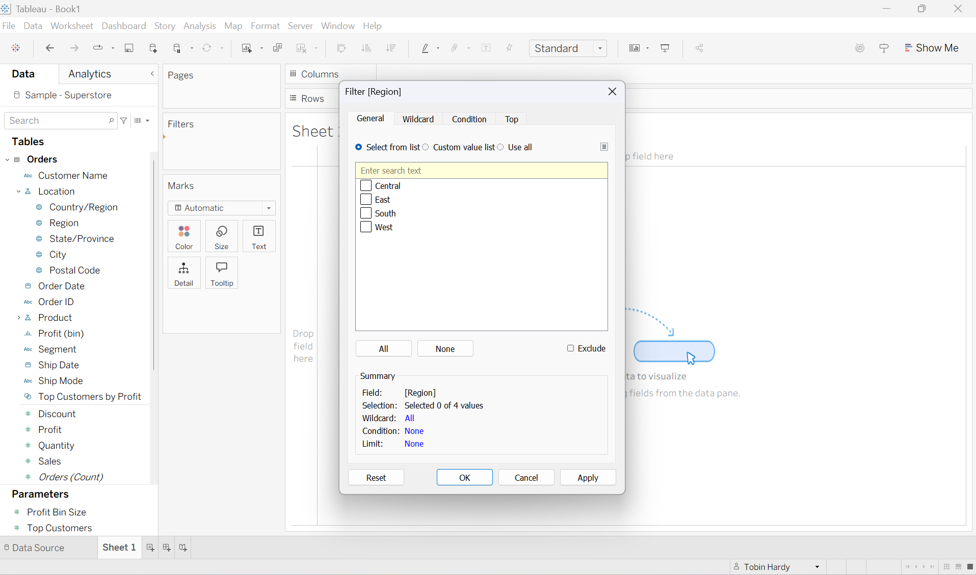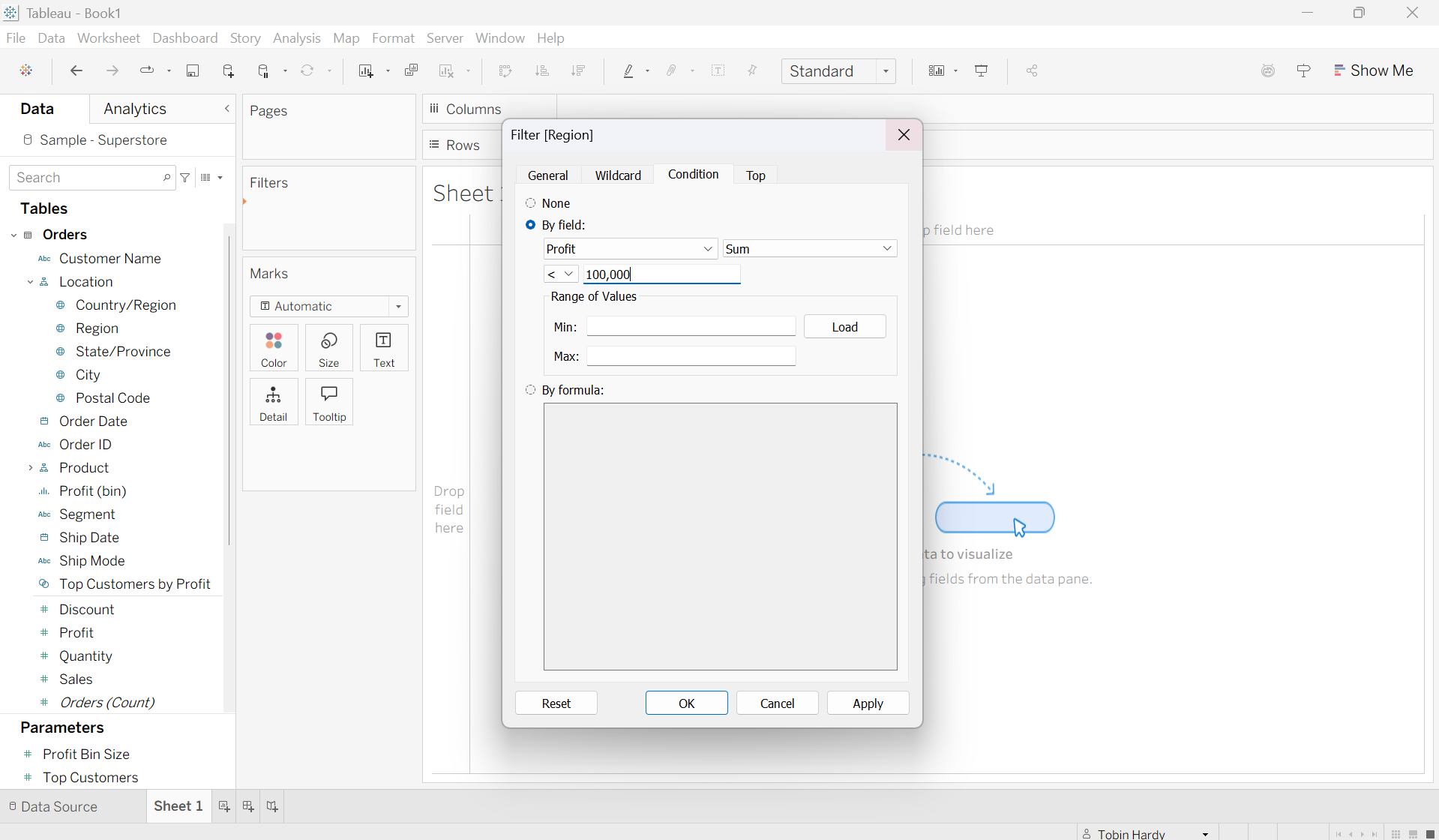 Within condition, you can filter by fields, range or formulas. In this example, I wish to look at only the regions with less than a total profit of $100,000. However, I could easily change the way it is filtered by clicking the box containing ‘<’. The field and aggregation it is filtered on can also be adjusted.