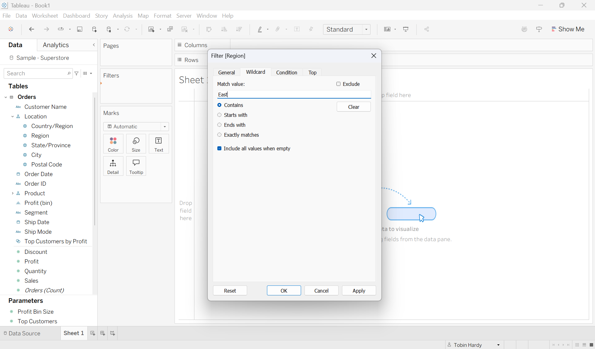 Here I can choose to either ‘include’ or ‘exclude’ items through a sort of “search bar.” For example, I could include only East by typing ‘East’ into the bar. You can also choose to filter by the starting or ending values of items.