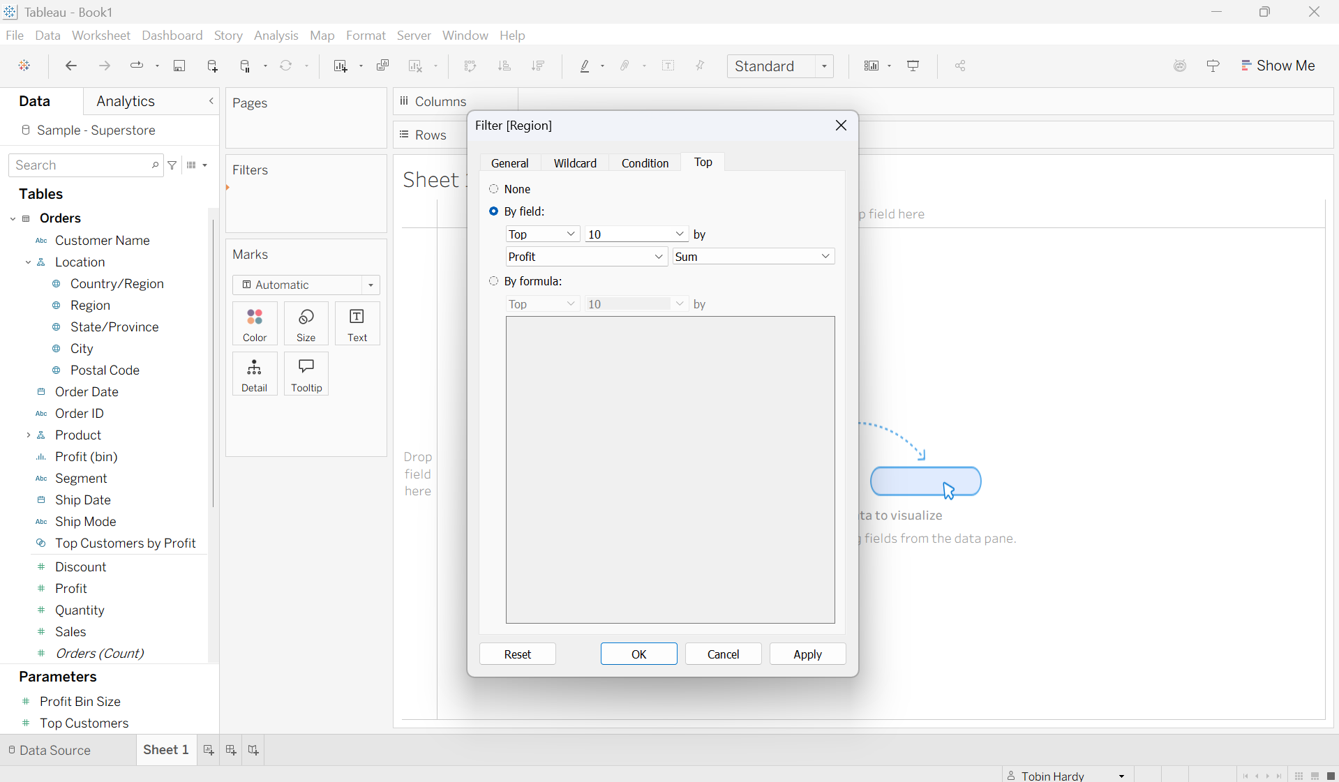 Here you can filter by the top (or bottom) number of “N” values. Where N is determined by the value of specified filters, or by a formula. For example, here I am looking to filter by only the Top 10 regions by total profit. Again, this filter can be adjusted to whatever field and aggregation you desire.