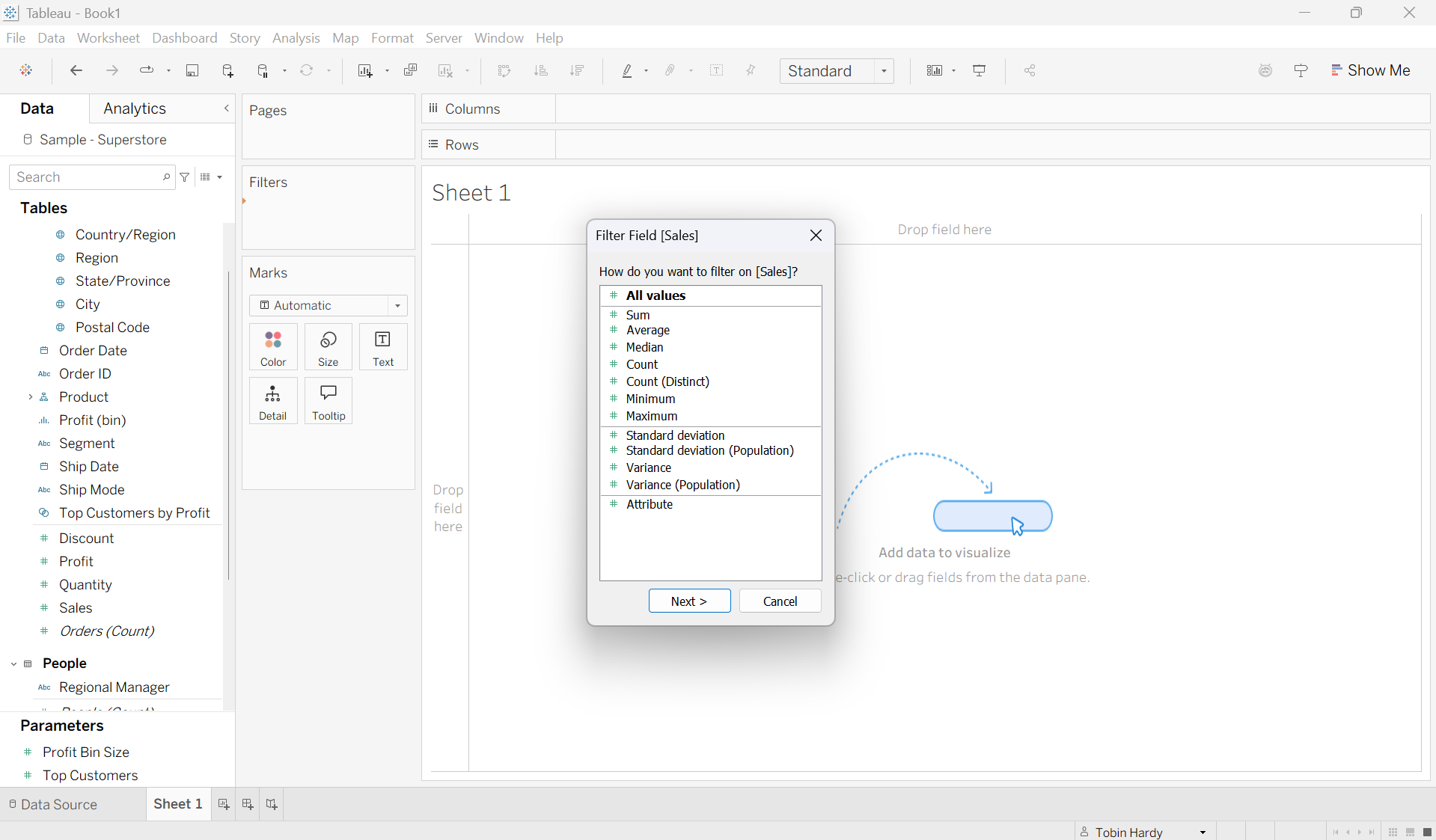 Placing a green field on the filter shelf leads to a different text page asking how you would like to filter the data based on an ‘Aggregation’ or on the ‘Raw’ data.