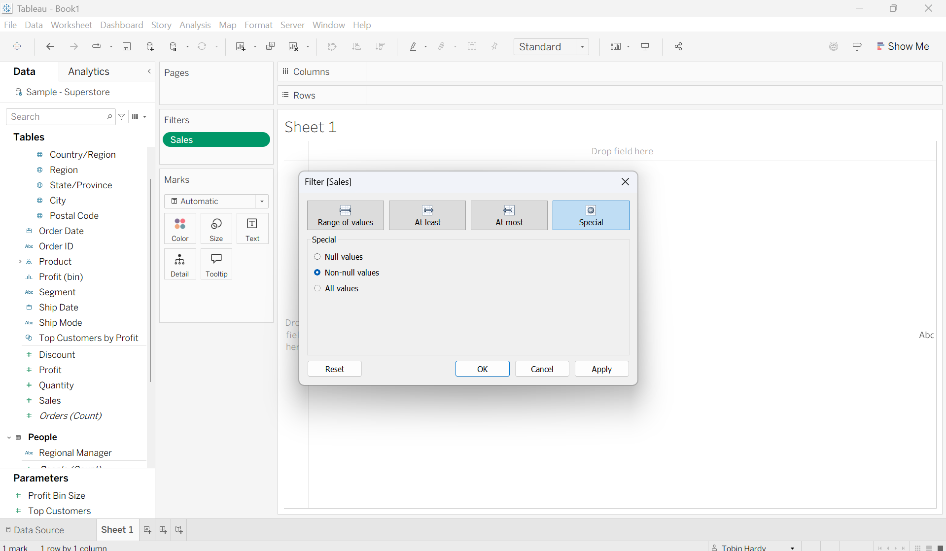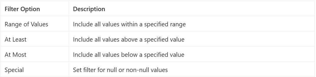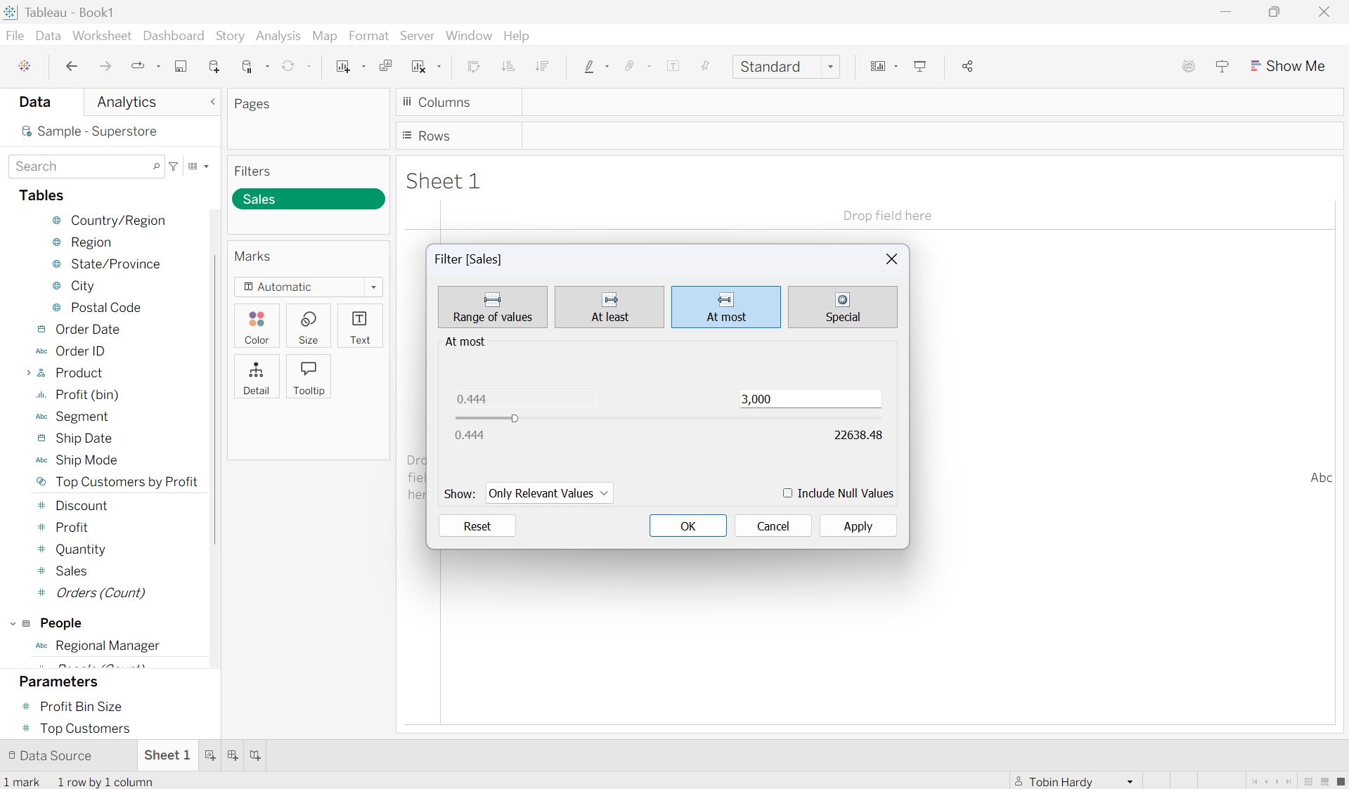 This option allows you to filter out all values outside of your selected minimum and maximum values (range). For example, here I want to only include items with Sales between 3,000 and 20,000.