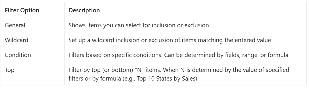 One of the many ways that these field types differ within Tableau is the way by which they can be filtered.