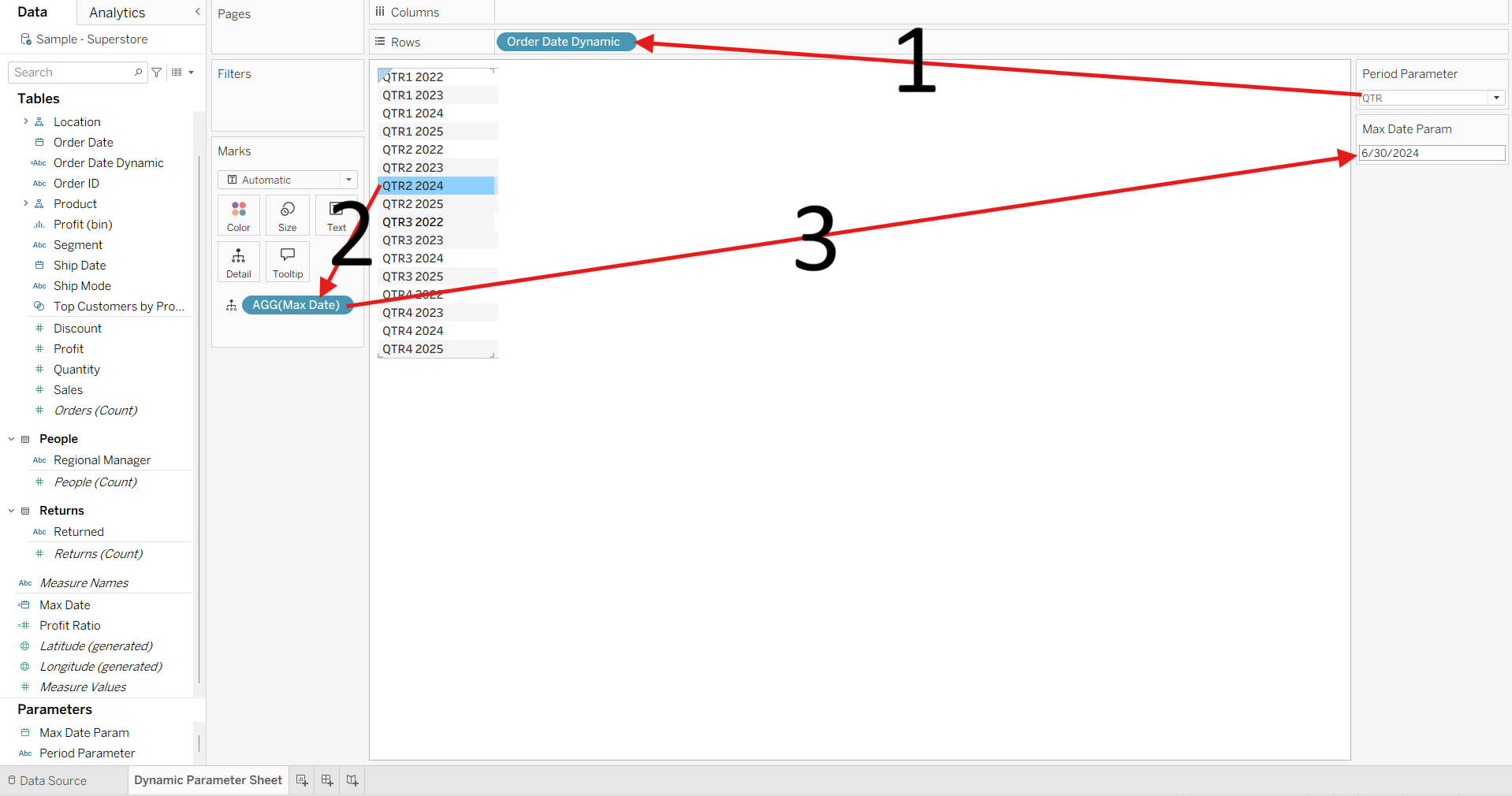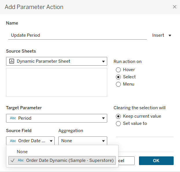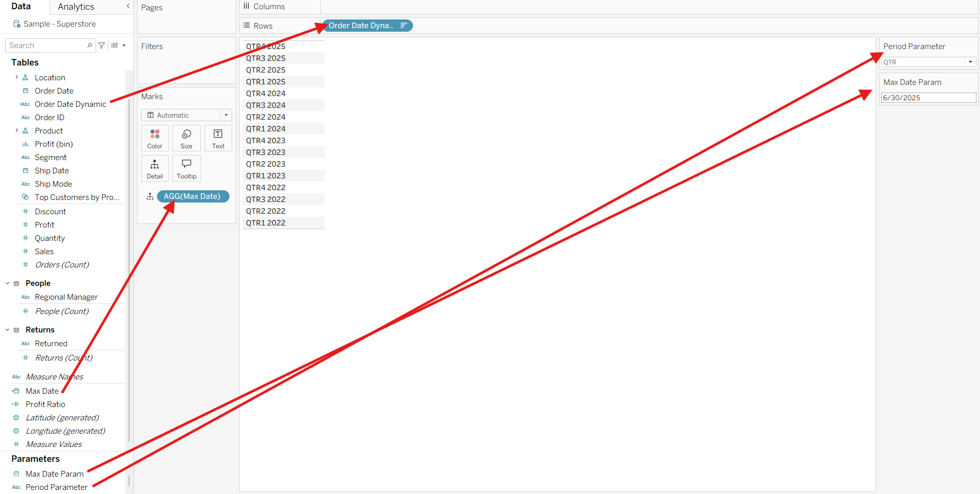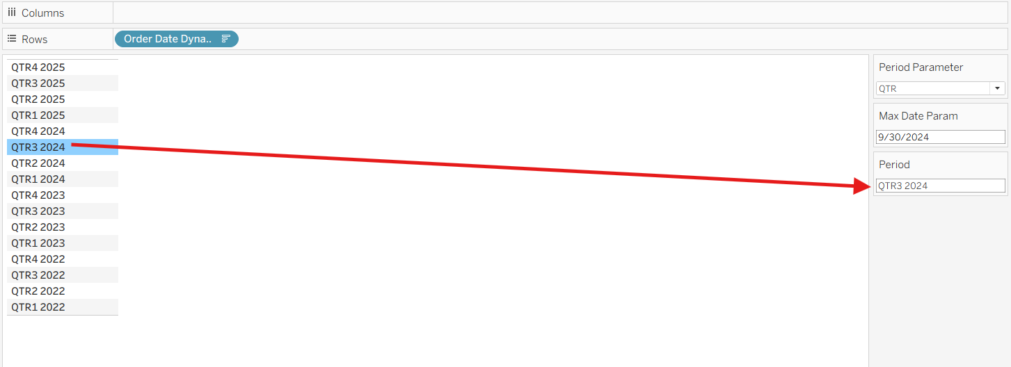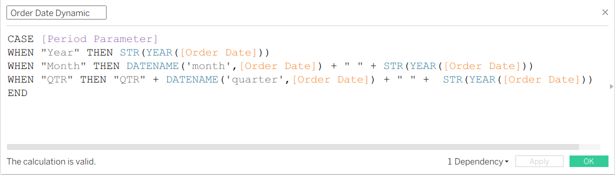 - Changing the Period Parameter would change the returned value of the Order Date Dynamic.