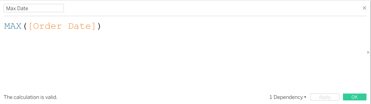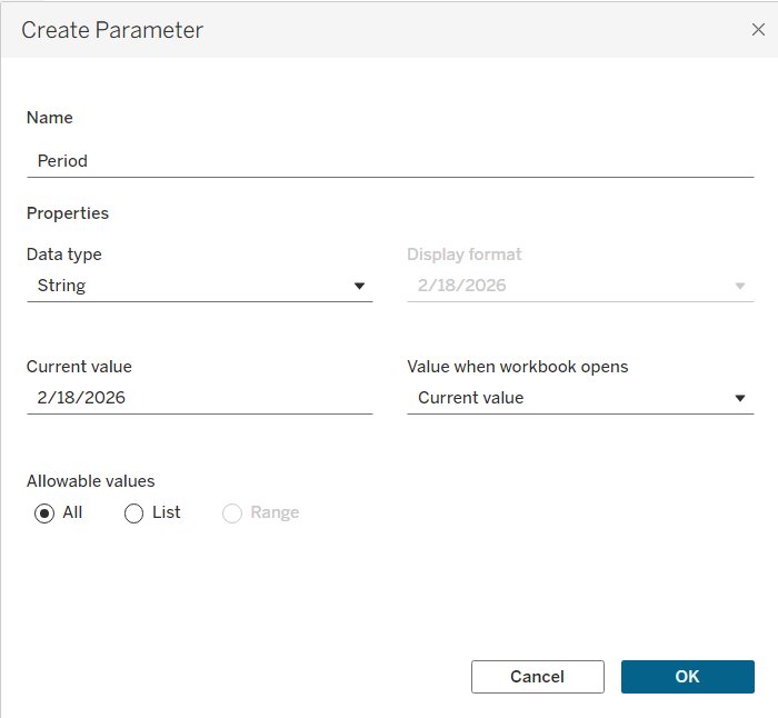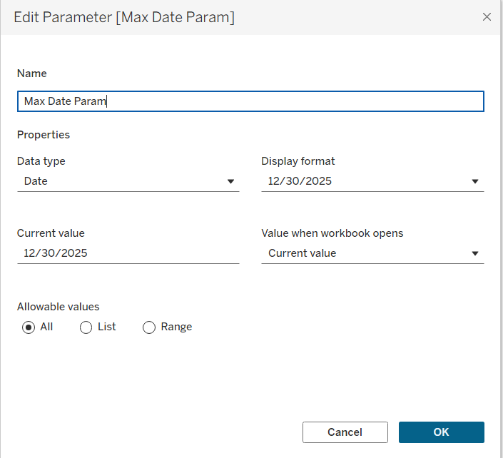 Now for this blog post, I decided to populate the Max Date Parameter with the latest date of the period, but if you want to return the period as a string, that is completely possible (easier too!).