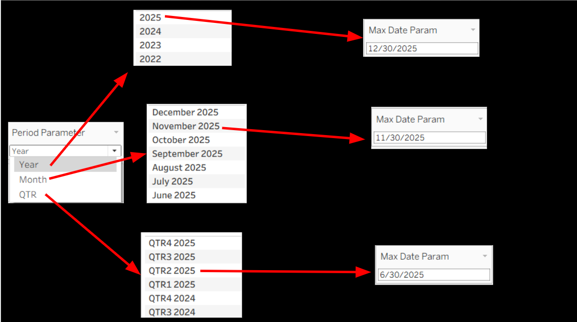 On the image below, the parameter on the right will allow you to select "Year", "Month" or "QTR". Depending on the selection, the drop down menu for what you will be able to select are different. Then, if you make a selection on the second step, the final/max date of that time period is plugged into a parameter called "Max Date Param" which you can use for calculations.