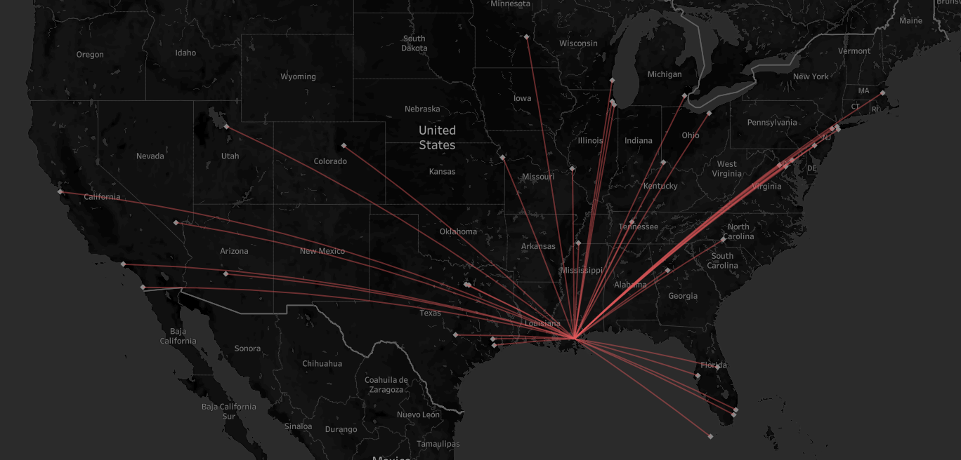 This map uses makepoints and makelines to plot all US flight paths originating from New Orleans.