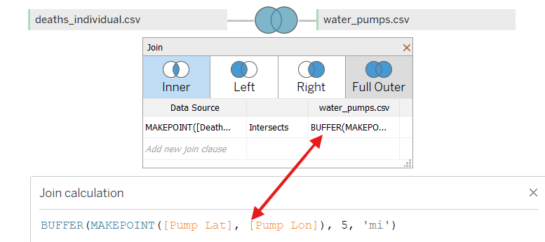 Result: Tableau physically joins the rows where the death point falls inside the pump's buffer zone. This creates a unified dataset where spatial proximity acts as the "key," allowing for powerful analysis without needing complex data prep tools.