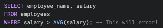 This query fails because of the Order of Operations of SQL (again, see my last blog post). The database cannot filter (WHERE) based on an aggregation (AVG) that hasn't happened yet.