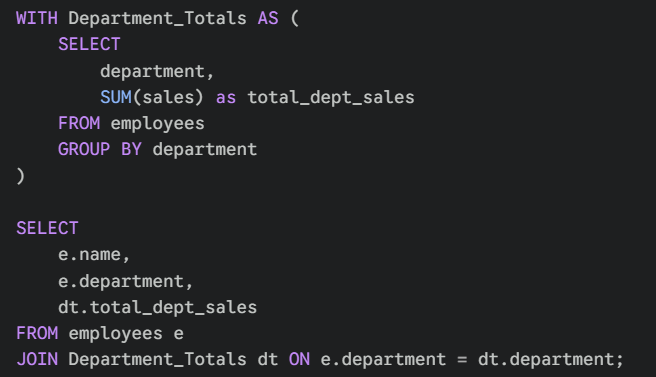 Department_Totalsmultiple times in your main query without having to rewrite the subquery logic every time.