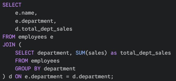 Subqueries in the FROM clause: You can also use subqueries to create a temporary "table" to query from. This is useful if you want to aggregate data and then join it back to the original table.
