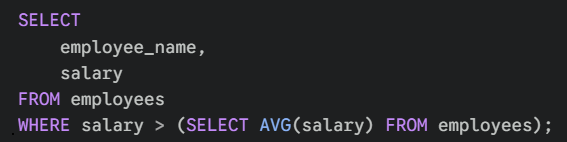 How it works: The database runs the inner query (in the parentheses) first. It calculates the average (e.g., 50,000). Then, it runs the outer query, effectively treating it as: WHERE salary > 50000.
