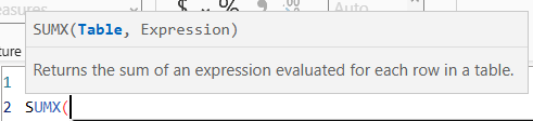 So for SUMX we want to refer to the table first and then write our expression.