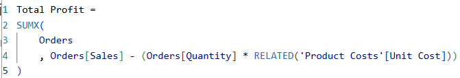 So this measure is saying, for each row in the Orders table, calculate the Sales - Cost (cost being quantity multiplied by unit cost).