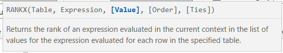 Value, order, and ties are optional (the measure will work without these). Value is the value to rank.