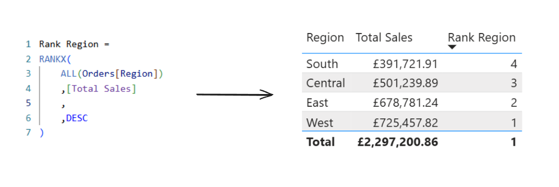 If we wanted to Rank Regions by Sales we could say for the Orders table, rank the Region by Total Sales, in descending order.