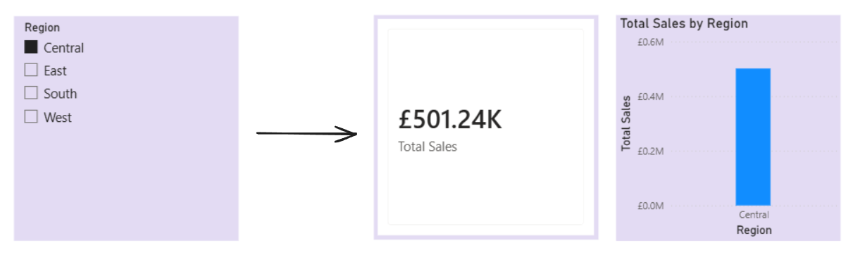 The SUM of sales would return the total sales depending on what filters are applied, such as Central Region. So in the example below, the KPI and bar chart are both showing the total sales for just the Central Region.