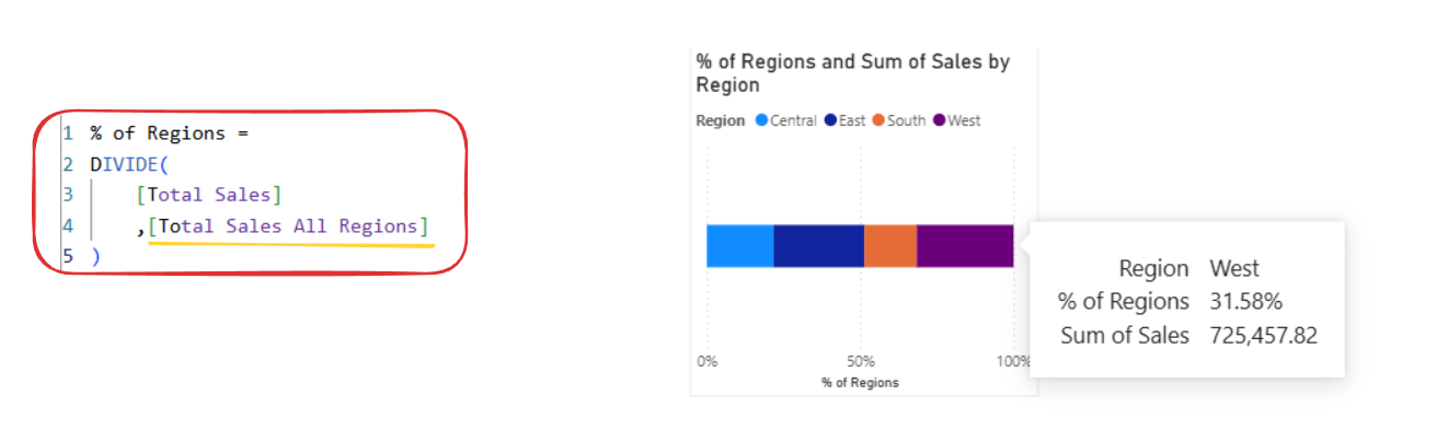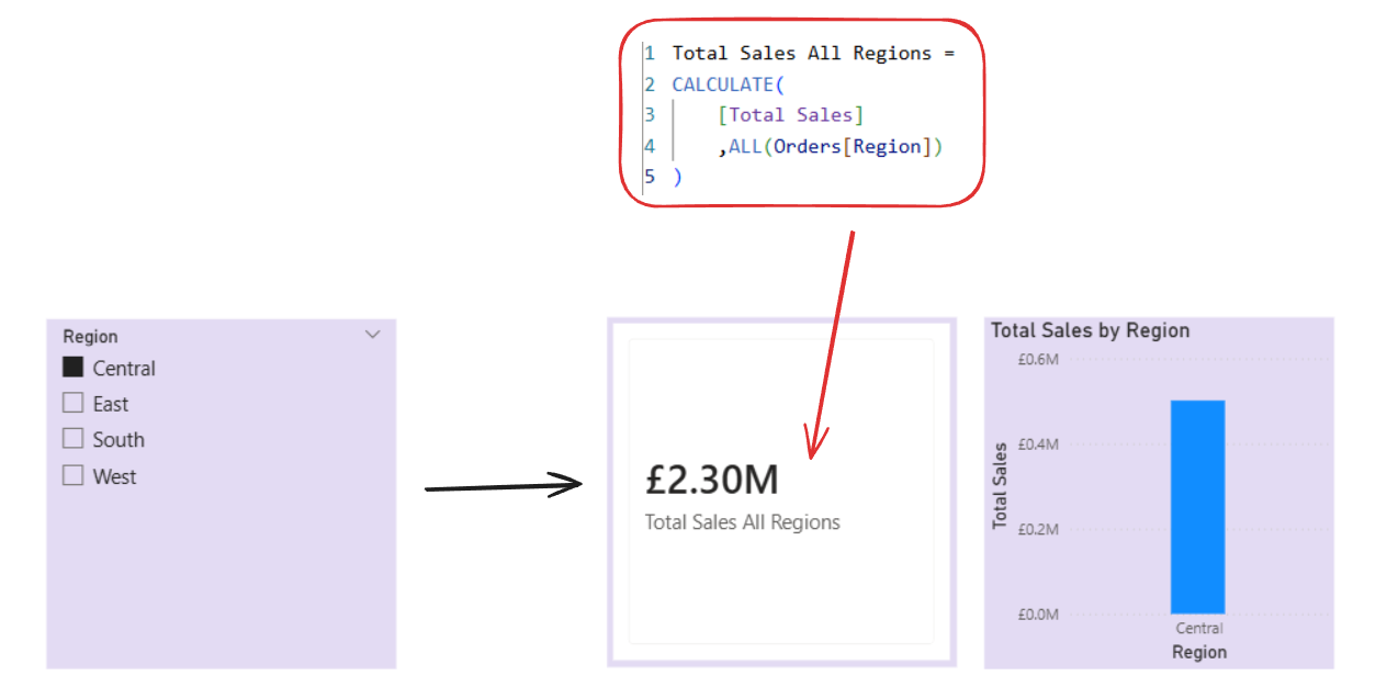 If we wrap a CALCULATE around it, that would change what's returned for example it could ignore Region overall. So now the KPI is showing the Total Sales for every Region regardless of the slicer still filtering to Central.