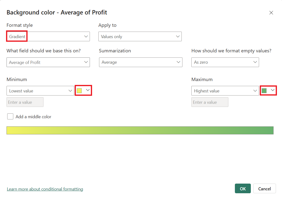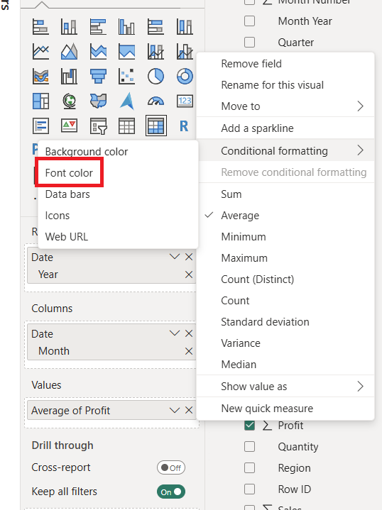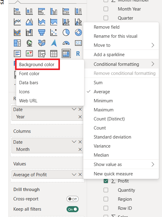 Having done that we are now at the key part of Table Heatmaps in Power BI: Transforming an ordinary table by applying conditional formatting. First we apply it to the background color by right-clicking onto Average of Profit, hovering on "Conditional formatting" and selecting the option "Background color".