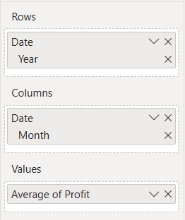We are adding the Year feature of our date table on rows, the Months feature of the same table on columns and average Profits from the Orders table for values.