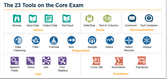 The Core exam is weighted towards core data preparation and transformation skills. The questions are spread across areas such as general Designer knowledge, input and output data, blending and parsing data, and transforming data.