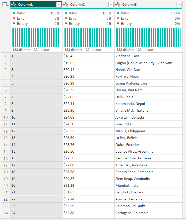 This is when I knew I'd bitten more than I could chew with the time I had assigned for web-scraping and data prep - each city had it's own url with information about the city on the page. On each page were multiple embedded tables relating to numerous things, from the cost of accommodation, cost of top attractions, transport and more! I needed to pull the tables for each city and union them together in order to do any analysis.