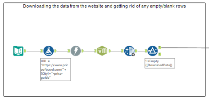 Everything was fine when I tested this workflow for the first two cities. However when I ran this for all cities, I noticed that the layout of the URLs were slightly different for some of the cities that had Child prices etc (instead of just Adult prices). This meant that the RegEx steps didn't generate the full table correctly for those cities. I attempted editing my RegEx a few times to correct this, but still couldn't get the desired output. Again, due to the time constraints I had to further reduce my scope and leave this table out of the workflow.