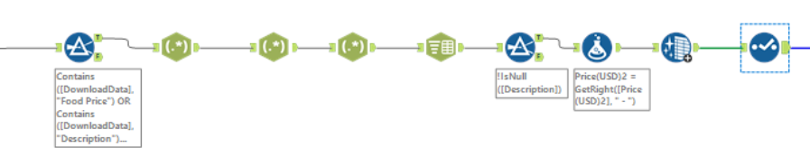 The next part of the workflow was focused on trying to pull the food price table from the webpages. I used a few RegEx tools, amongst a few others, to essentially parse out the columns and values I wanted to form the table I needed. This is shown in the image below.
