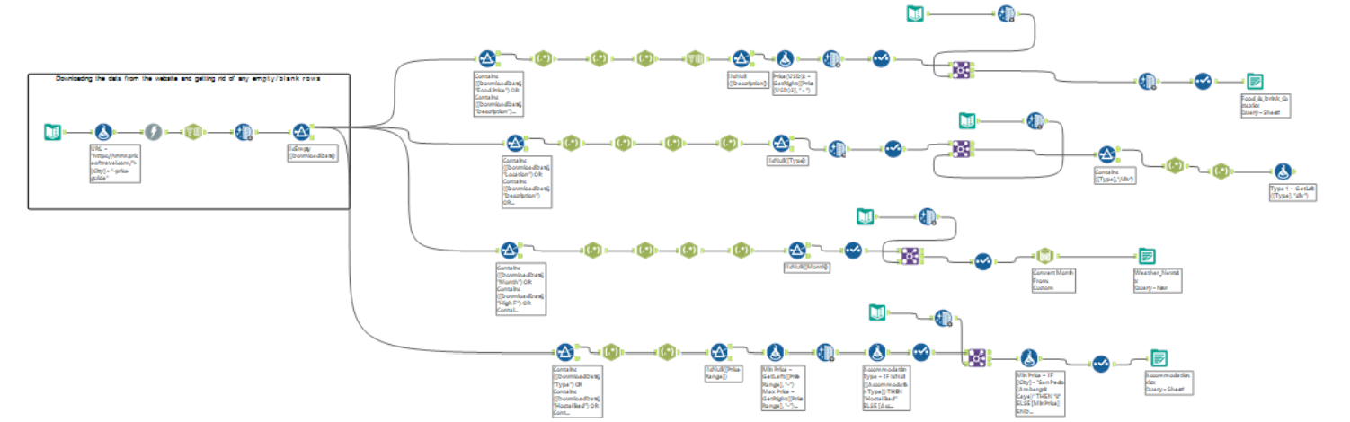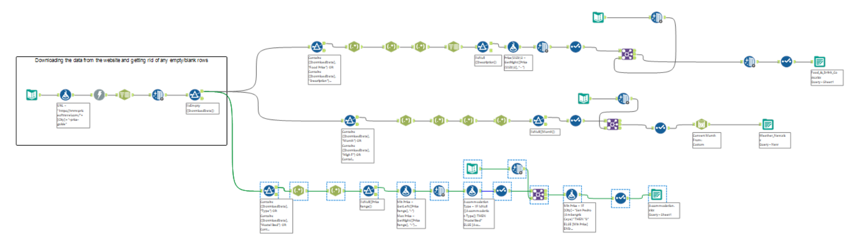 My final workflow, which pulls the Food Cost table, Weather table and Accommodation (Hostel) Cost table for all the cities, can be seen below.