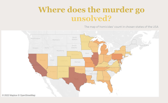 Despite the fact that the map has its own title, the choice of colour and closeness to the main title indicates that this map showcases states and their statistics regarding unsolved murder cases. And it doesn't, it's just the total count of homicides across states considered in the data source.