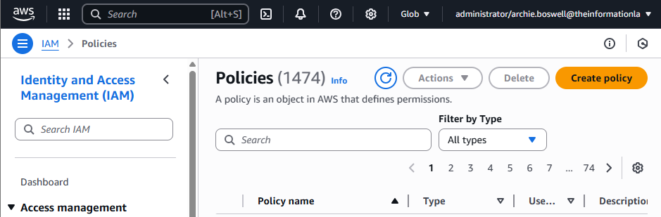 - Navigate to the policy tab under the IAM section and select 'Create Policy'