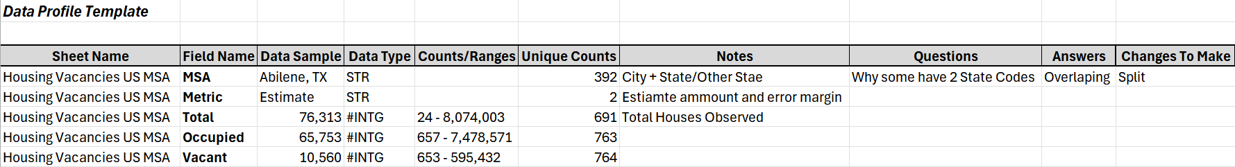 Before diving into visualization, I conducted data profiling to understand the structure, quality, and distribution of the dataset. This step was essential in identifying key attributes such as total houses observed, occupied and vacant properties, and unique counts across MSAs. The profiling results (see image below) provided a clear foundation for my analysis.
