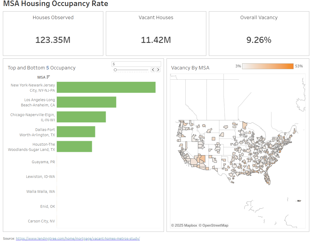This week, I participated in Makeover Monday 2024 - Week 11, where we explored housing vacancy rates across various U.S. metropolitan areas. The dataset was sourced from LendingTree’s study on vacant homes, highlighting the percentage of empty properties across different cities. The original visualization provided an overview of housing occupancy rates, featuring a map that highlighted vacancy rates by MSA (Metropolitan Statistical Area).