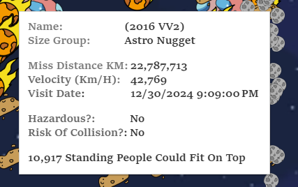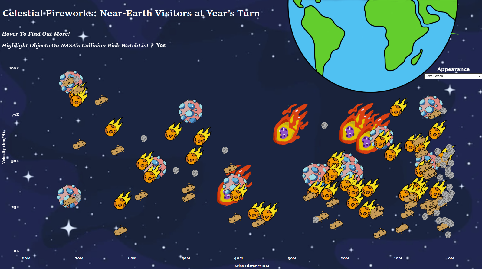A parameter filter was also added, allowing users to switch between viewing all asteroids for the week or only those arriving on New Year’s Eve — turning them into symbolic space fireworks.