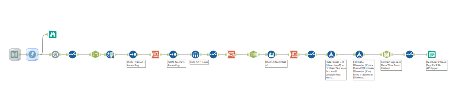 The process began with building a workflow in Alteryx to connect to the API, retrieve the data, and convert it from nested JSON into a flat, usable format. The selected date range focused on the week surrounding New Year’s Eve, inspired by the idea of presenting incoming asteroids as “space fireworks.”