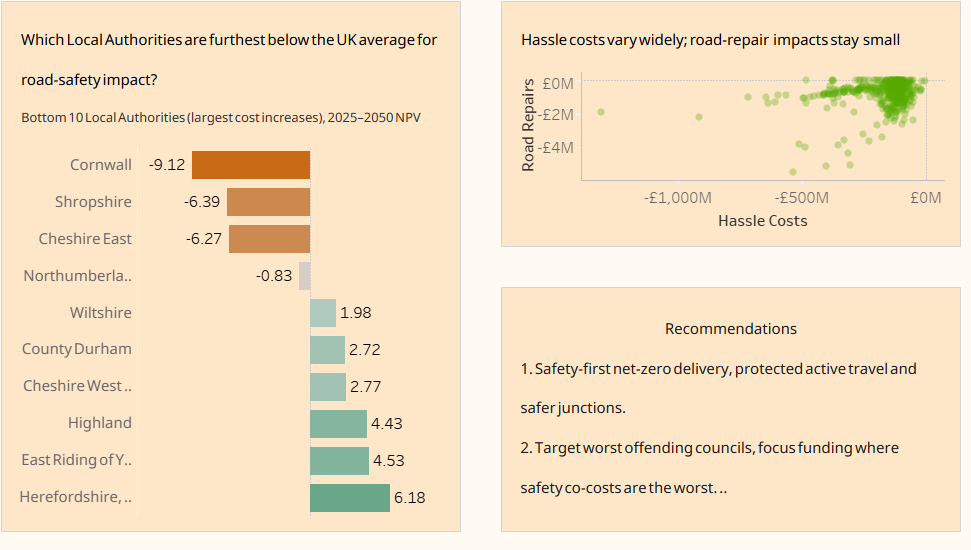 Despite a well-laid plan, the practical execution of the dashboard required crucial pivots. When initial visualizations failed to deliver the sharp, impactful monetary story needed to persuade Local Councils, I quickly switched the core categories being compared, settling on the high value, direct cost savings derived from Road Repairs and Road Safety to maximize persuasive power.