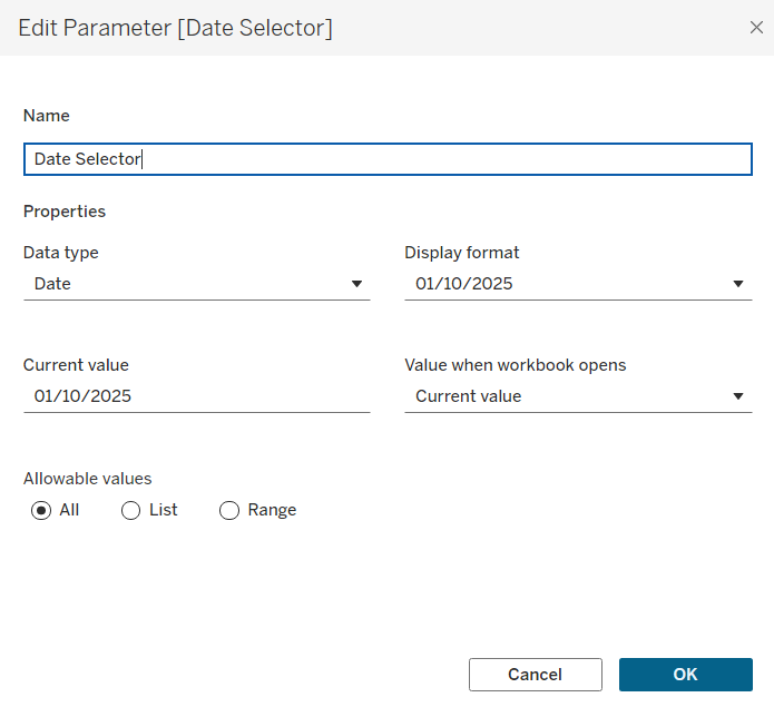 Step 1: Create a Date Parameter, by clicking the drop down by the data pane. The parameter configuration should look as follows