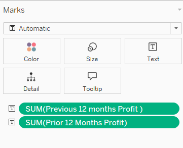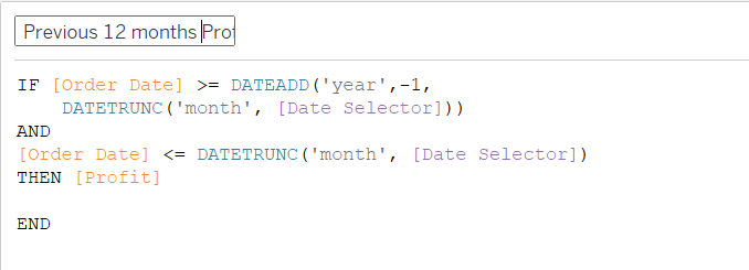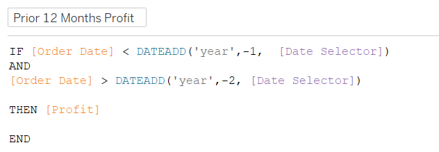 The entire expression calculated the sum of [Profit] for orders that occurred in a specific 12-month window before the last year.
