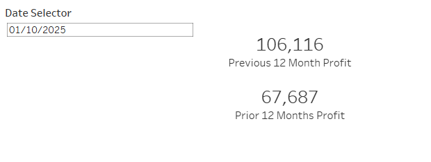 If you have ever stumbled across dynamic KPIs that show year on year change and have no idea how to create them, look no further as this blog will aim to provide a step-by-step on how to create a KPI showing the profit from the previous 12 months of a date selected with a comparison to the year prior to that.