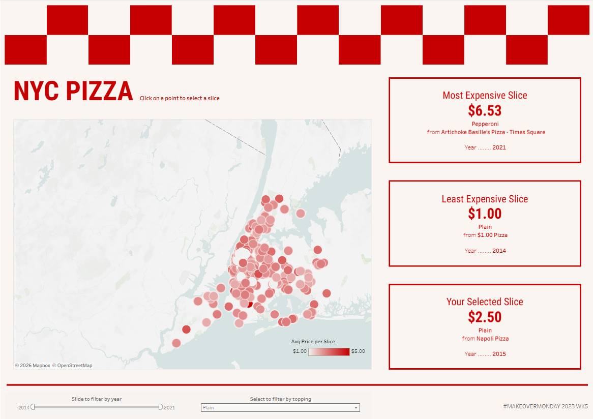 In a recent Makeover Monday, I decided to use the time to focus on formatting. In this challenge, I created a dashboard looking at prices of pizza slices in New York. Check out the final dashboard here!