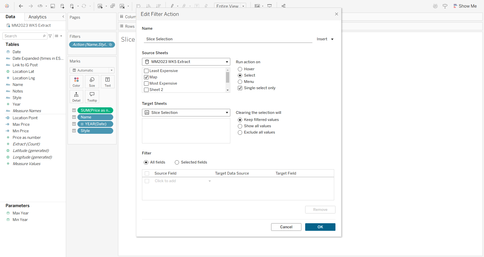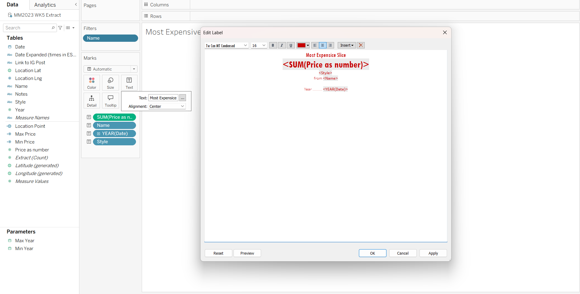 Next I created my KPIs. For these, I added Price, Location Name, Year and Style to the Text on the Marks Card.