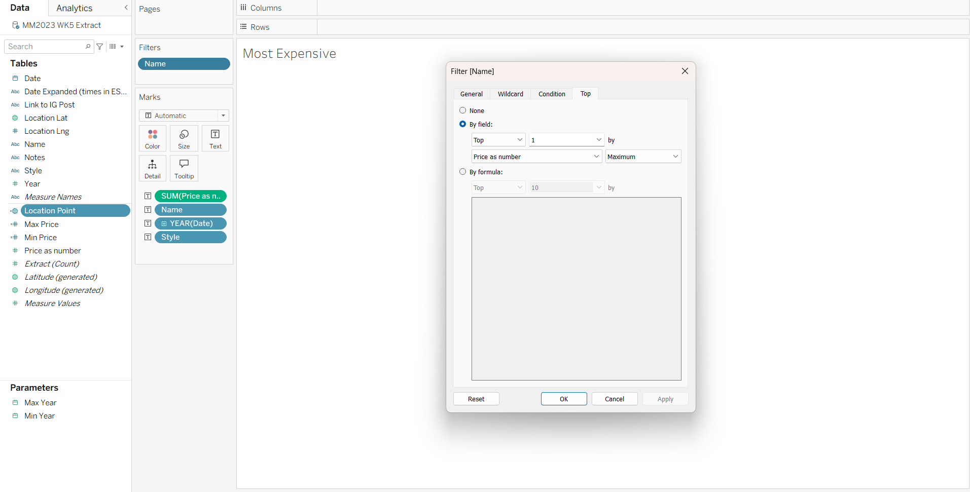 For the Most and Least expensive slices I filtered the location name to Top 1 by Maximum / Minimum Price: