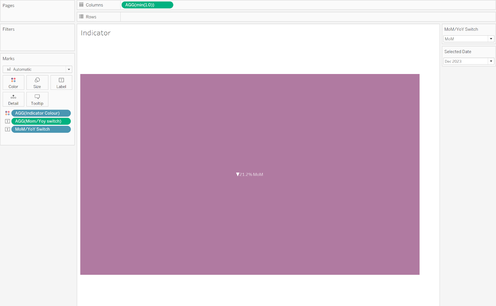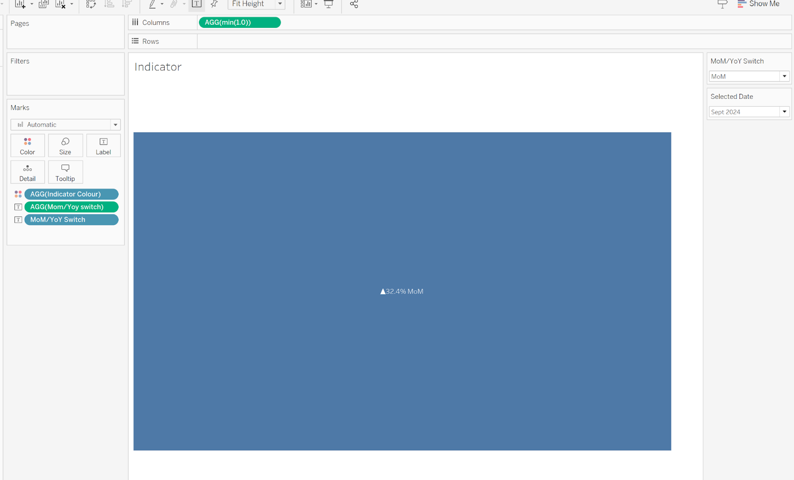 Indicator bars are a simple but effective way to show whether a metric has increased or decreased over time. By combining parameters and calculated fields, you can build a single indicator that dynamically switches between Month-on-Month (MoM) and Year-on-Year (YoY) change, with colour and directional arrows to highlight positive and negative movement.