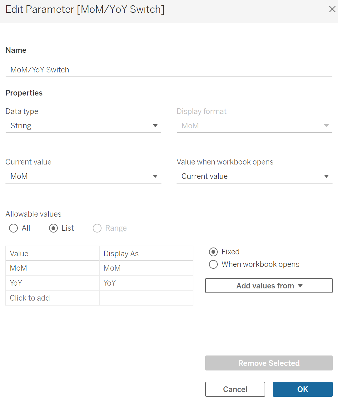 Step 2: Create a Parameter to Switch Between MoM and YoY