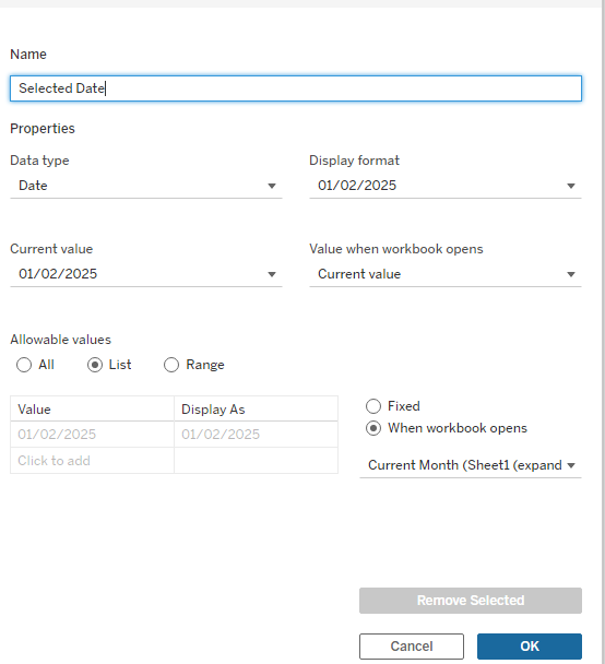 Once the parameter has been created, a calculated field is required to link the selected month to the date field in the data.