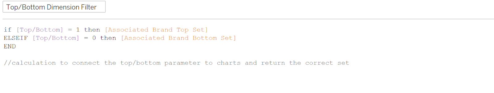 Next, create a calculated field that connects the Top/Bottom parameter to the sets you have just created.